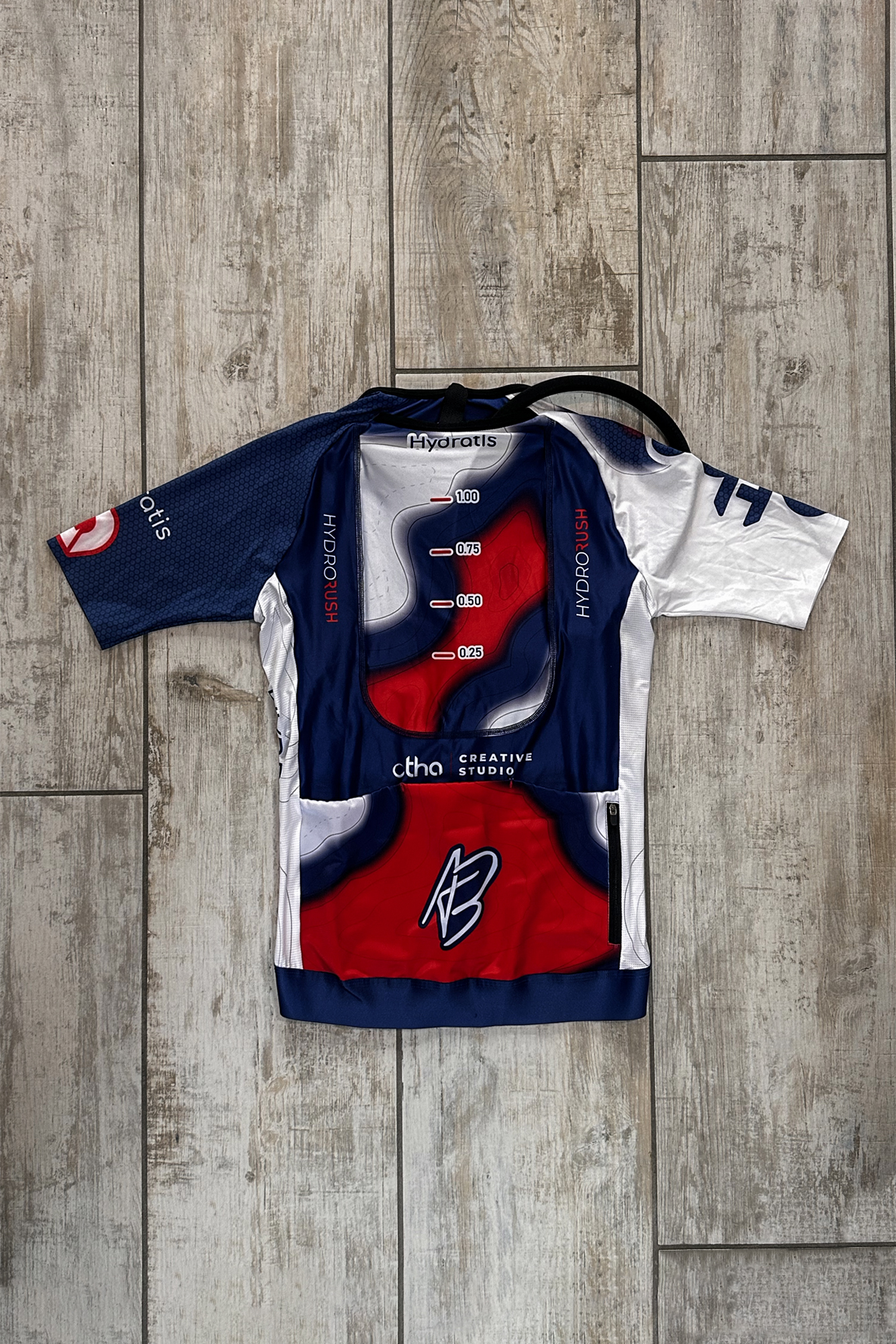 Le maillot Hydrorush est conçu pour intégrer une poche d’hydratation dans le dos, ce qui influence le fit du maillot.